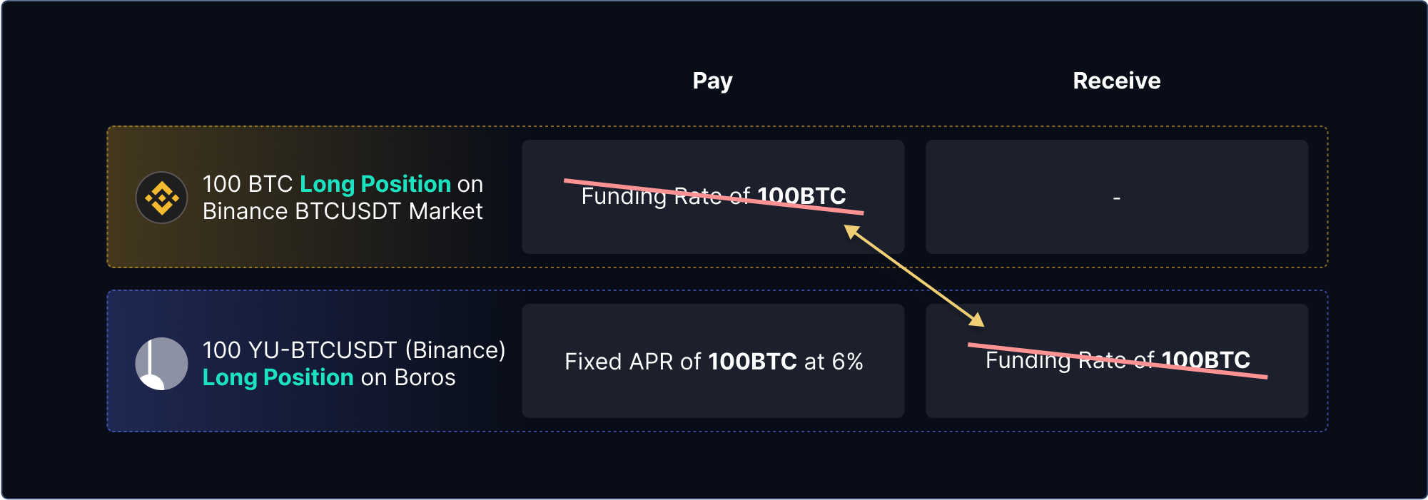 To hedge this funding rate position, the trader opens a long position of 100 YU-BTCUSDT(Binance) on Boros at an implied APR of 6%.