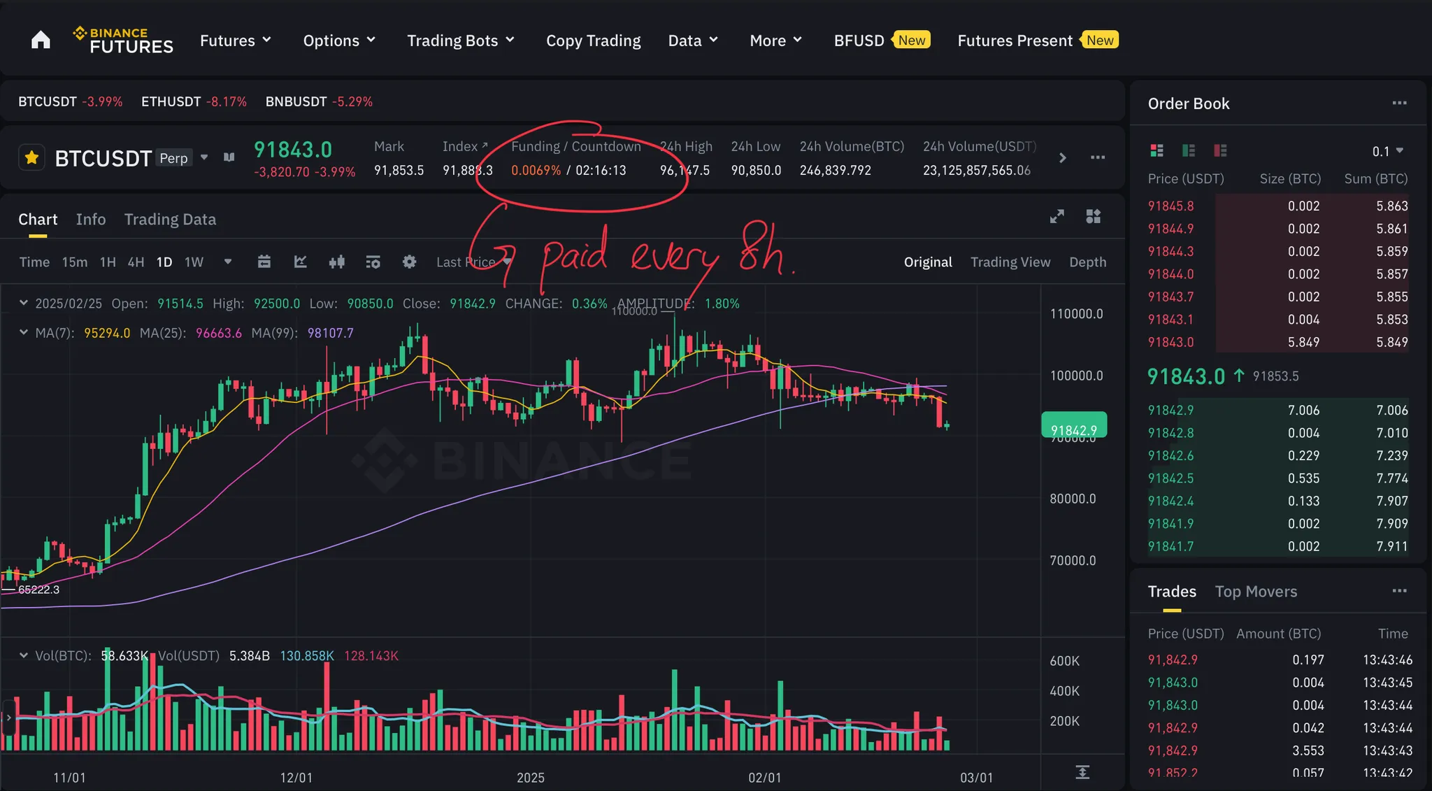 Let’s use an example of a trader with a long position of 100 BTC on the Binance BTCUSDT market, effectively paying funding rates on 100 BTC while the position remains open.