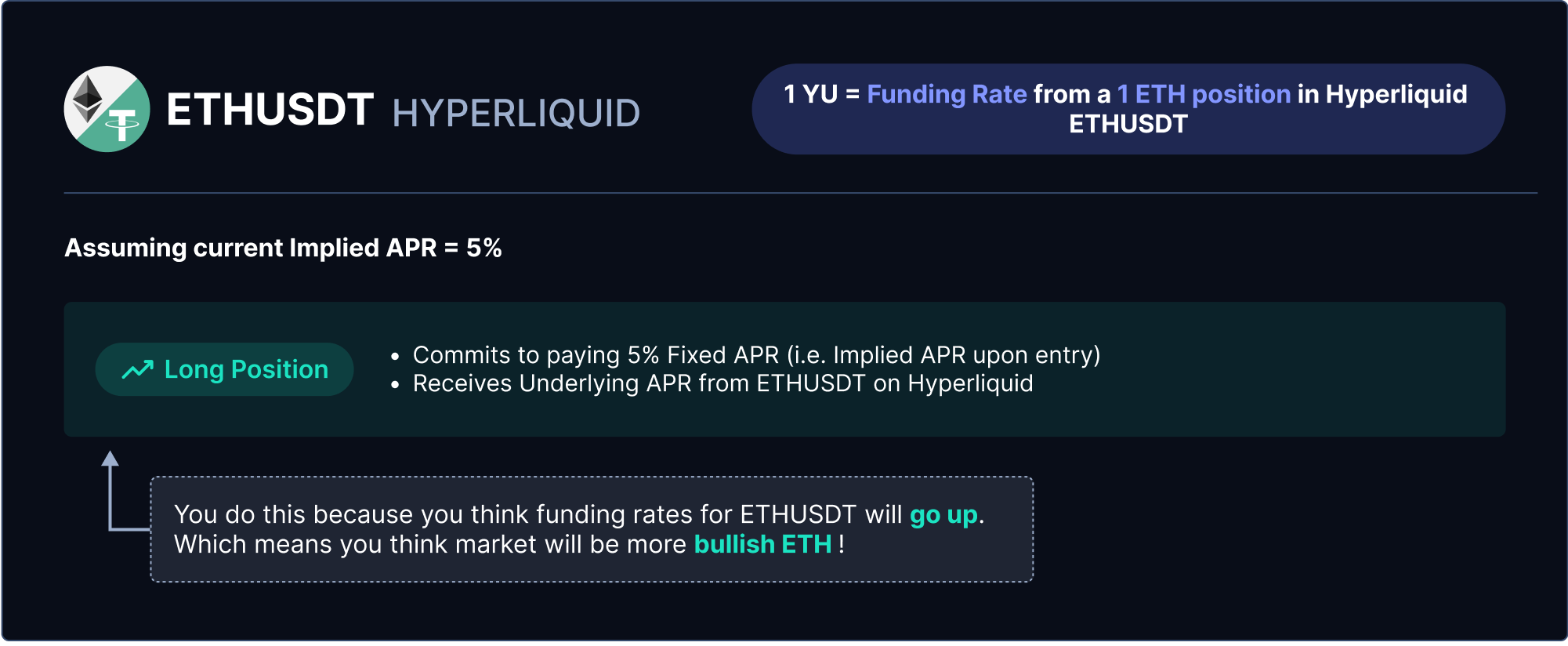Similarly on Boros, if you expect the funding rate to increase, you should enter a long position on YU. This is achieved by paying the current “price” or “Implied APR” of YU in exchange for the Underlying APR.