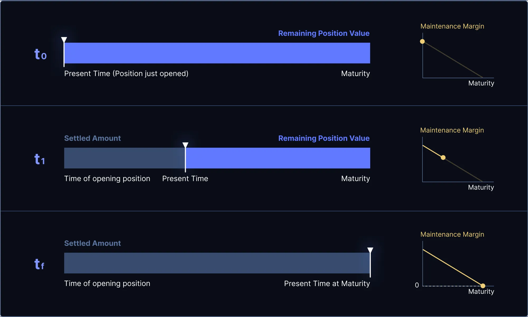 The maintenance margin on Boros declines linearly to the margin floor until maturity as the position approaches maturity, assuming all other factors remain constant.
