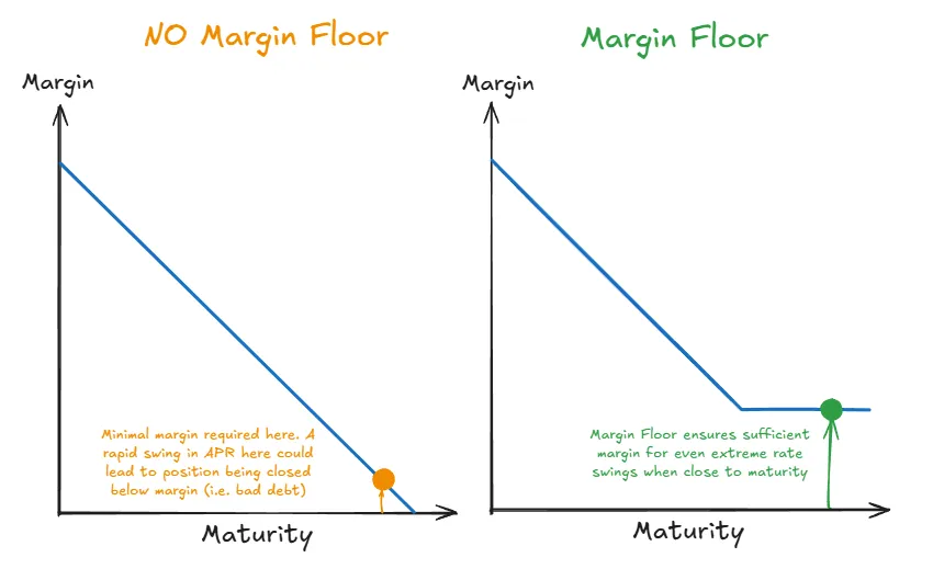 Without a Margin Floor, a position that is close to maturity will only be backed by a minimal amount of collateral. Given that funding rates can experience sharp fluctuations over short periods, significant rate changes could force positions to close at an implied APR below the Maintenance Margin, potentially leading to bad debts.