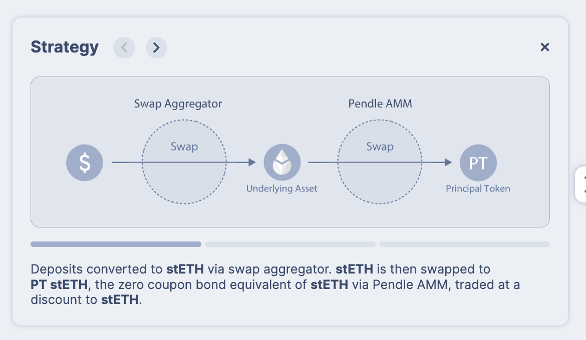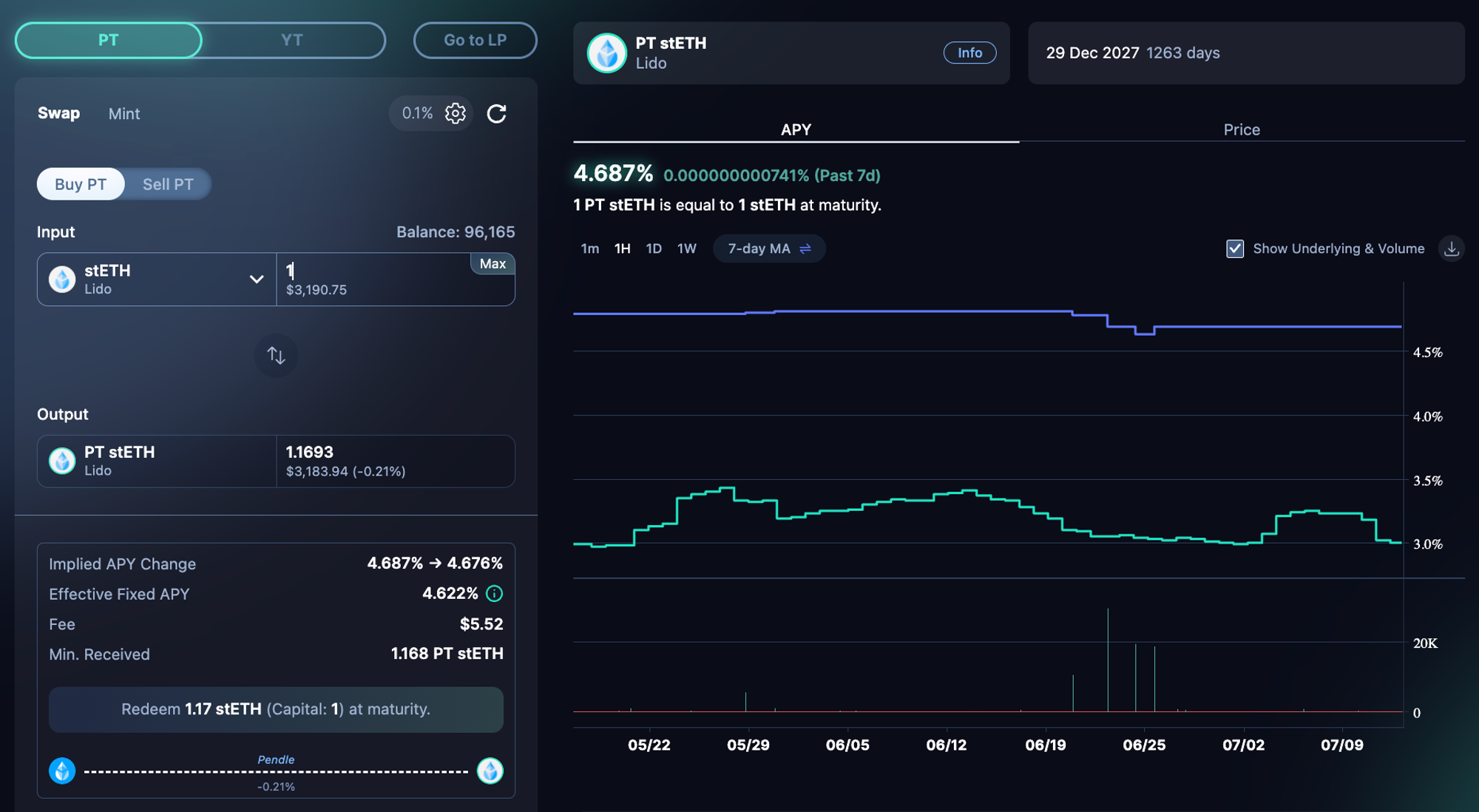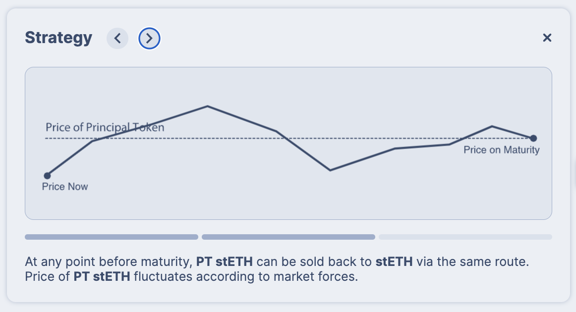 Behind the scenes, you are swapping your deposit for the Principal Token (PT) of your chosen asset. You buy the PT (PT-stETH in this example) at a lower price than the underlying asset (stETH in this example). Your PT can be redeemed 1:1 for the underlying asset (stETH in this example) at or after the maturity date. In other words, the price difference is your yield at maturity.